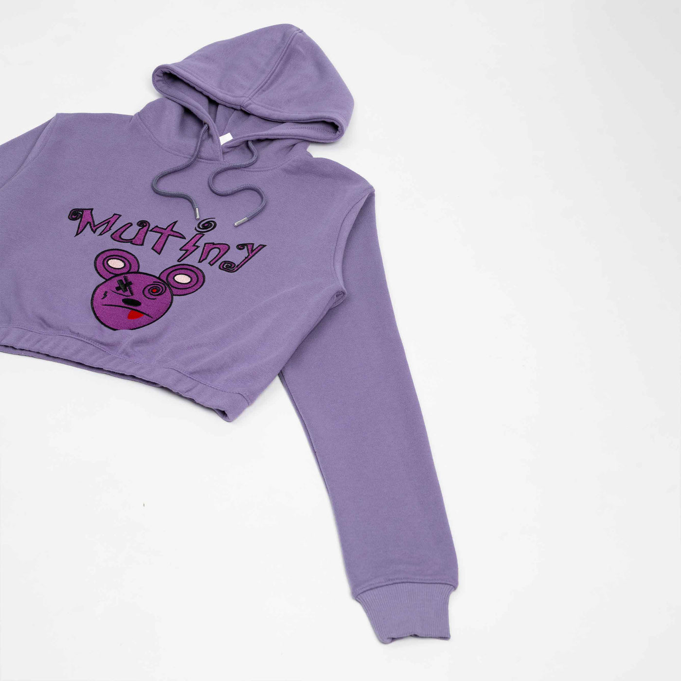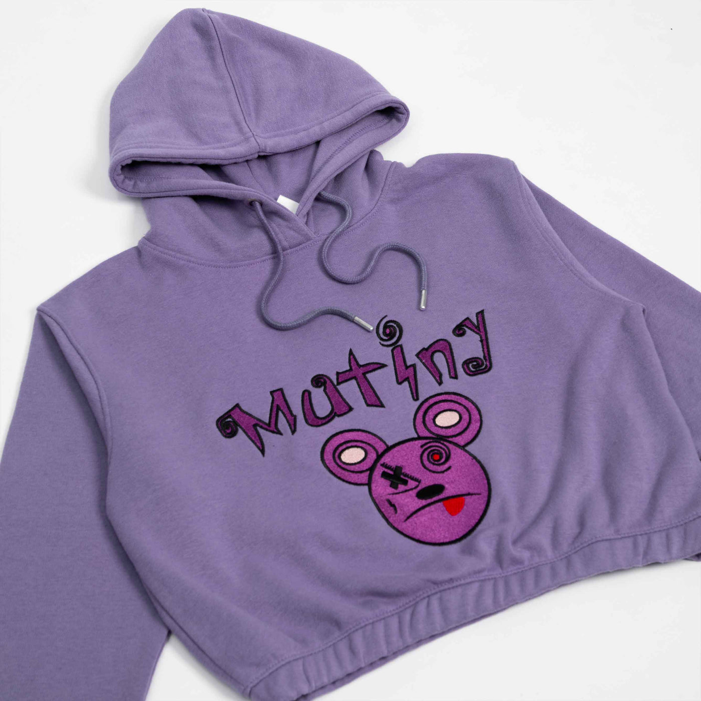 A trendy purple cropped hoodie featuring a bold printed design. Made from soft, comfortable fabric with a relaxed fit, ribbed...